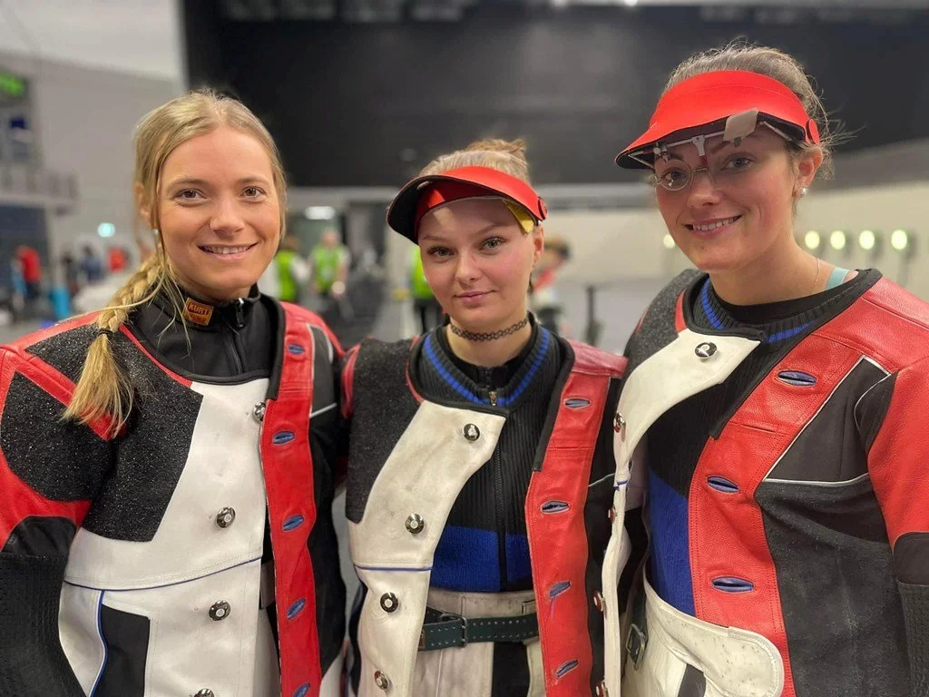 De norske seniorjentene hadde et stort mesterskap i Estland, og ble kronet med EM-gull i tremannslag. Fra venstre: Katrine Lund Numedal, Jenny Stene Kisen og mesterskapets dronning Jeanette Duestad fra Nøtterøy. FOTO: Norges Skytterforbund
