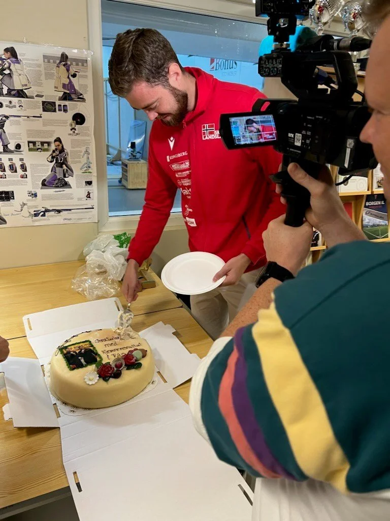Jon-Hermann Hegg og Jeanette Hegg Duestad sine prestasjoner under verdenscupen i Brasil ble fredag formiddag feiret med kake i Alfhallen, sponset av Lilleng i Holstad Våpen.
