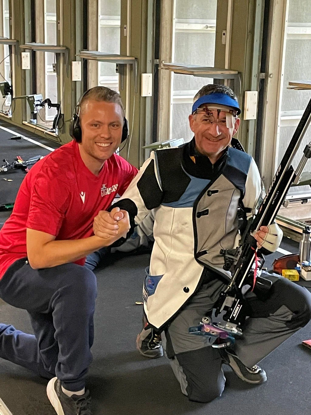 Simon avbildet sammen med Rajmond Debevec etter 60 skudd liggende i EC Århus. Debevec er en av de største utøverne i ISSFs historie med både OL-gull, VM-gull, EM-gull og flerfoldige medaljer i verdenscup.